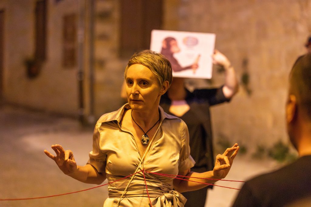 Dans une déambulation nocturne accompagnant une femme seule, cinéma et théâtre viennent s’entremêler et laissent émerger le tournage collectif d’un film mettant en scène la Peur. Une invitation à questionner les récits dominants, à se les réapproprier et s’en émanciper.